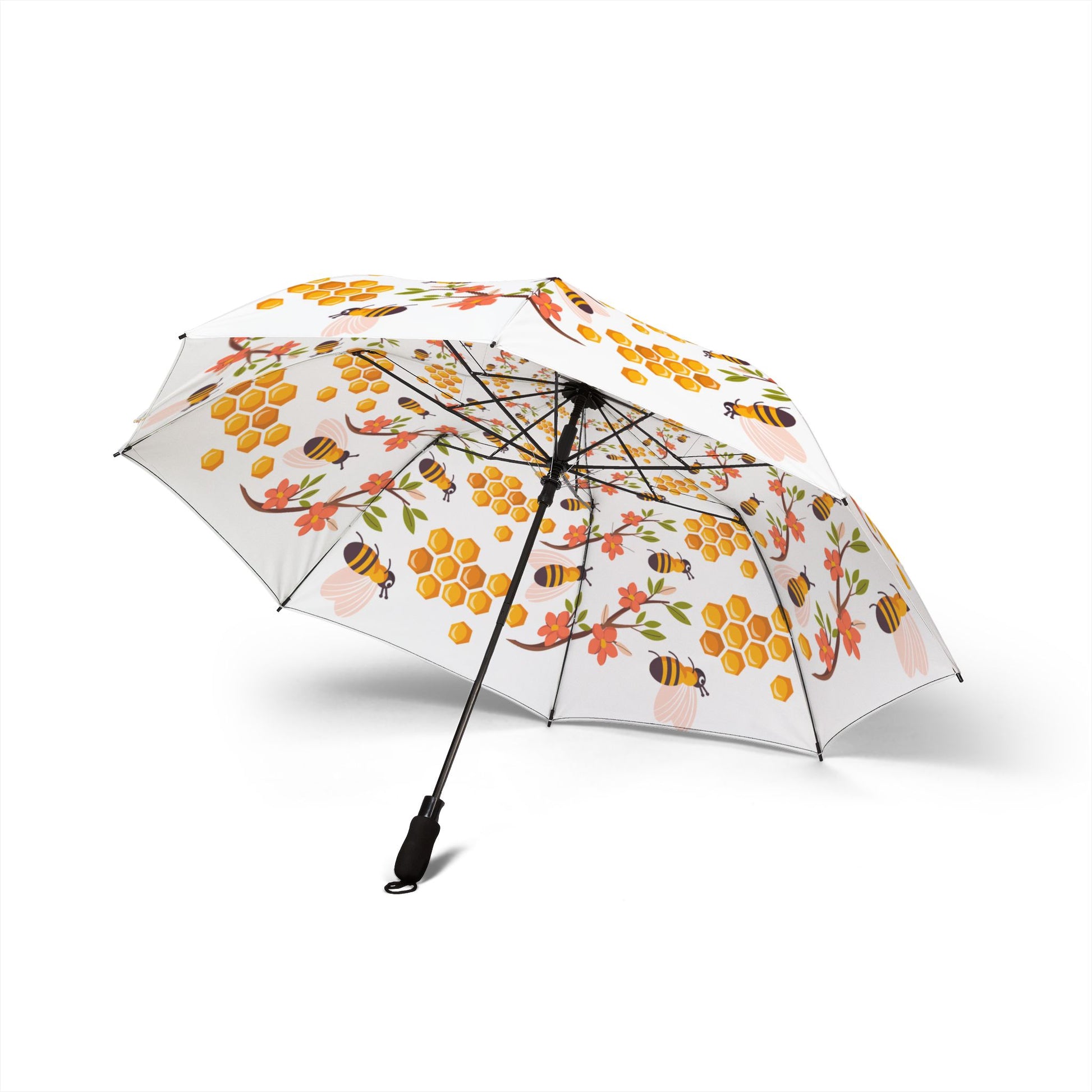 Lightweight and cheerful, this foldable umbrella brings a honeyed touch to rainy days. The white canopy is printed with warm honeycomb clusters, busy bees, and delicate blossoms arranged in a soft, spiral pattern that feels bright without being loud. It opens in a single smooth motion with the semi-automatic mechanism, then shelters you beneath durable 8-rib support and quick-drying polyester pongee fabric. The heat-sublimated print stays vivid through seasons. A comfortable rubber handle, wrist strap, tie-wrap, and matching sleeve make it easy to carry and store, small details that add up to everyday convenience. Carry it on dog walks, market runs, or commute days when you want a little sunshine in the clouds.