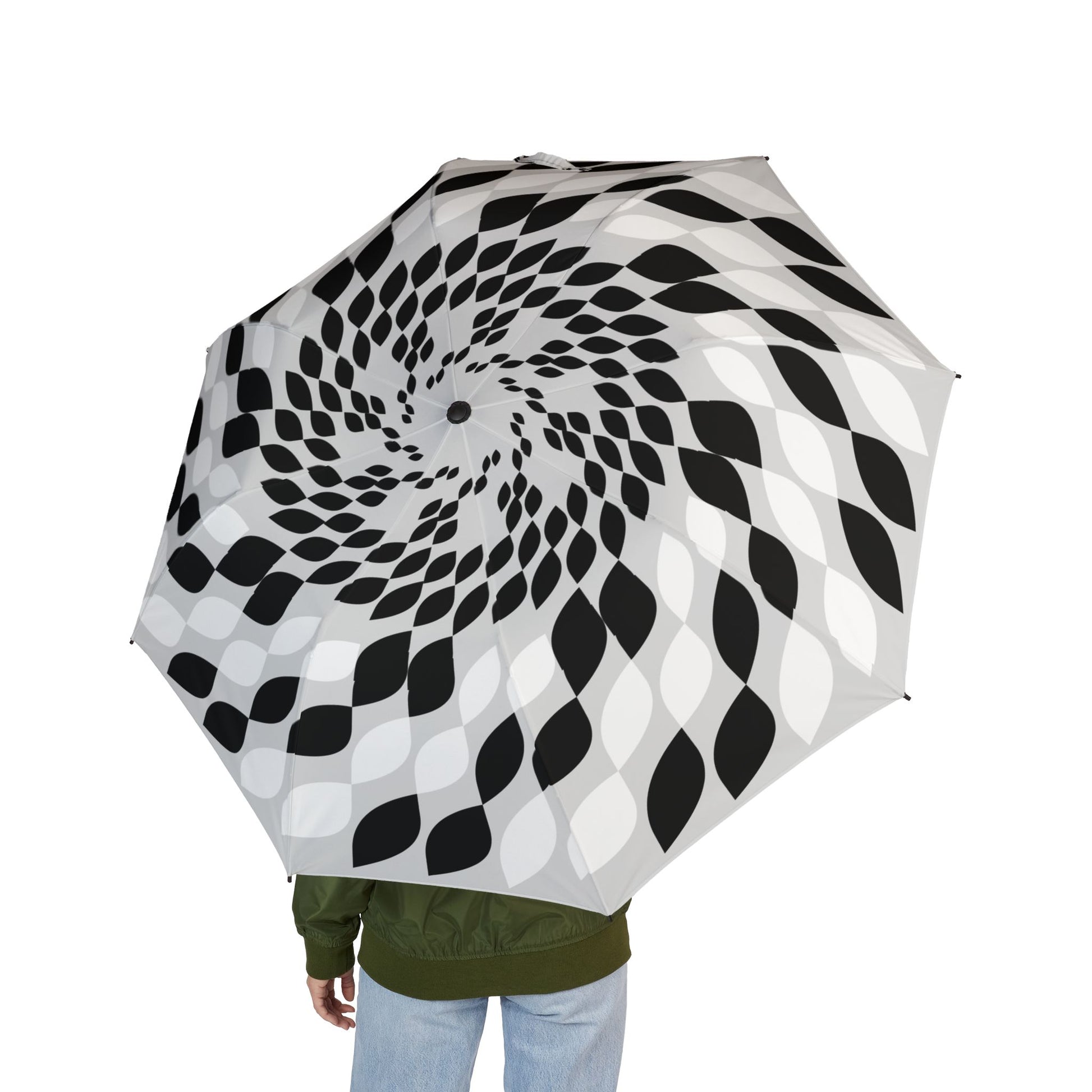 This lightweight, semi-automatic umbrella blends practical engineering with bold, graphic style. The black-and-white spiral motif feels both modern and hypnotic, a design that stands out on cloudy streets. Built from durable 100% polyester pongee with heat-sublimation printing, the canopy keeps its contrast and resists fading. Eight strong fiber ribs give the frame reliable support in gusts, while the rubber handle and wrist strap make it comfortable to carry and quick to use. It folds compactly into a matching sleeve that mirrors the canopy pattern, so it slips easily into a bag without losing its flair.