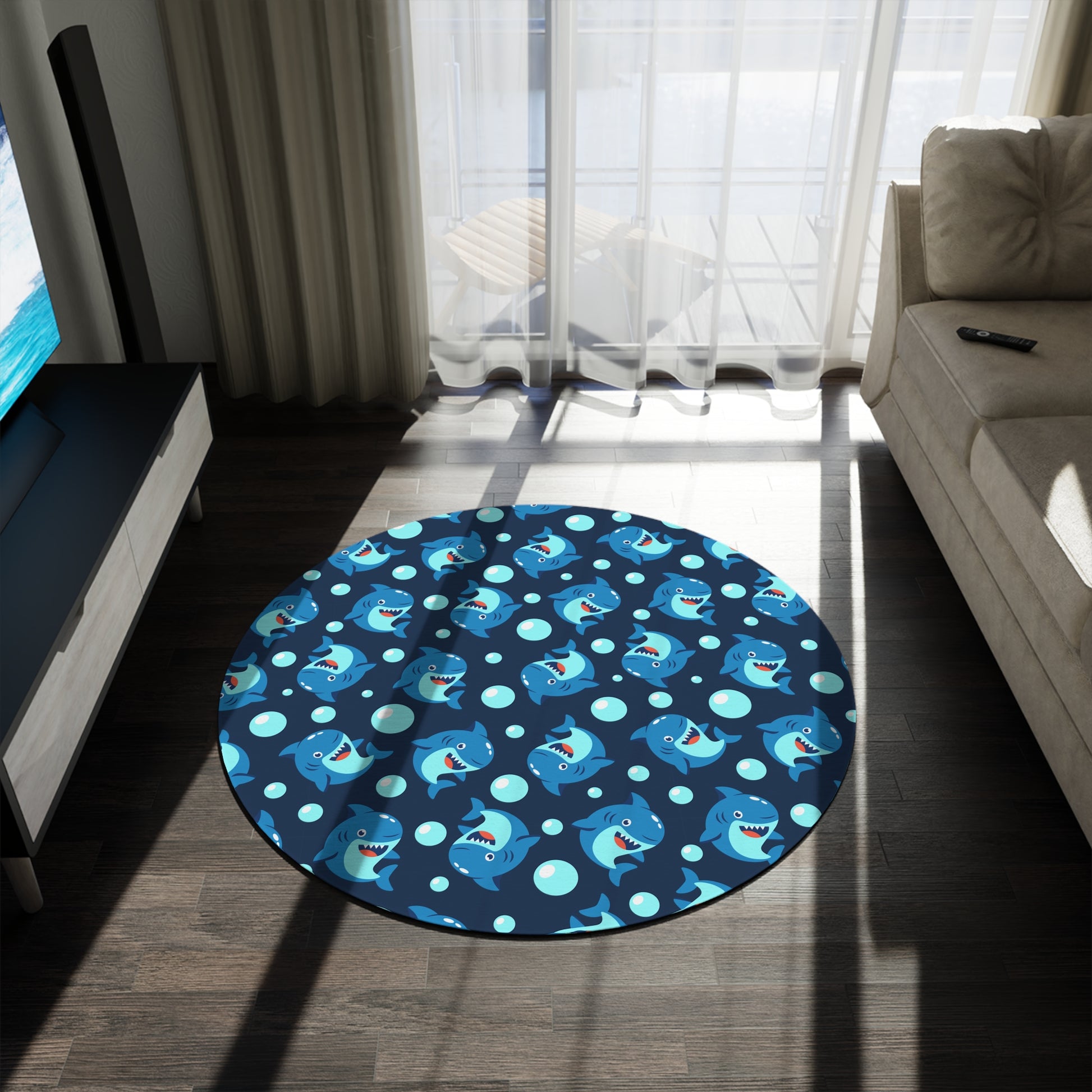 Bring a playful, ocean-side vibe into any room with this round chenille rug. Soft underfoot and richly colored, the rug features a repeating cheerful shark motif set against deep navy with bubbled accents - lively without being loud. Use it to define a cozy reading nook, brighten a child's playroom, or anchor a beach-themed corner. The 60" diameter creates a generous, welcoming circle that invites little feet and curious hands to linger.
