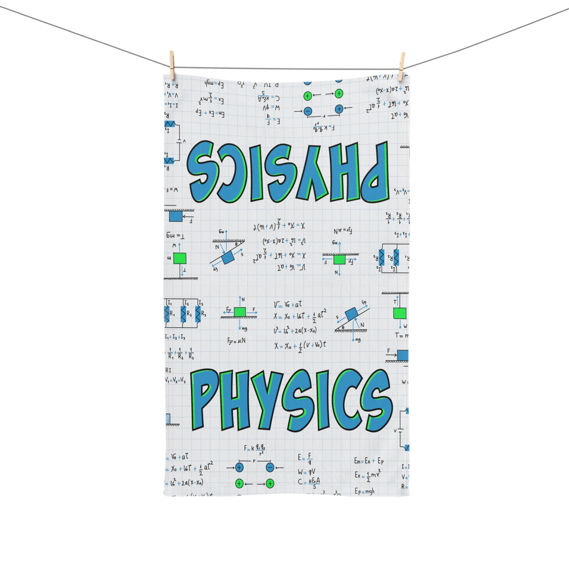 Explore the laws of the universe from the comfort of your couch with this stunning teal physics hand towel featuring formulas and equations.